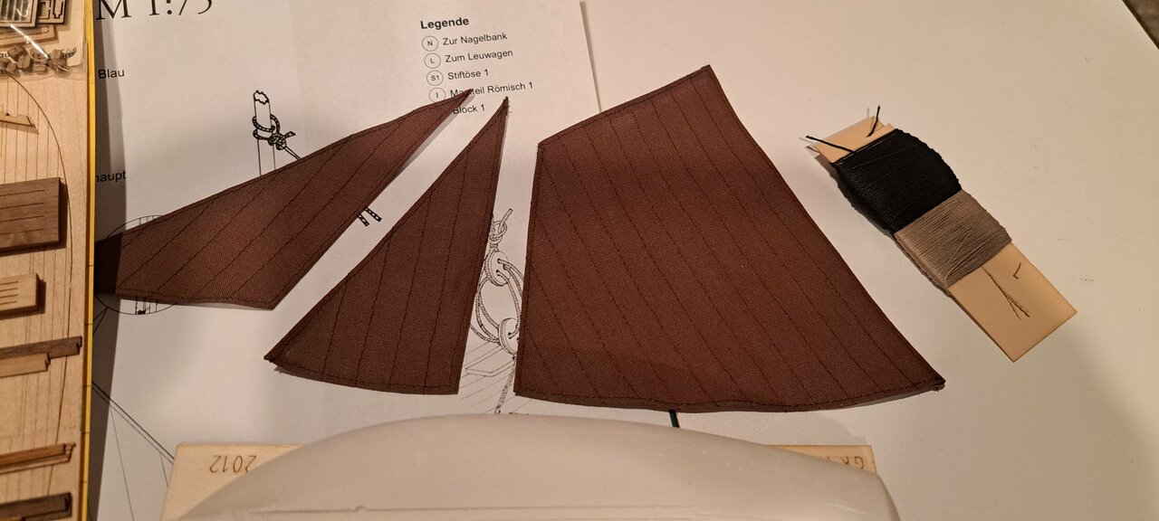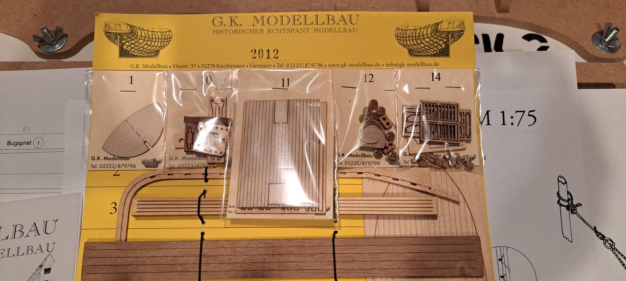 Hamburg, 28.01.2024: Nach dem Auspacken des Modellbausatzes wird zunächst eine erste Bestandsaufnahme vorgenommen: Der Bausatz enthält detaillierte Baupläne samt 1:1 Riggplänen und Segelrissen im DIN-A3-Querformat, eine 12seitige, bebilderte Bauanleitung im DIN-A4-Format mit mehr als 40 Baustufen-Fotos, und eine bebilderte, 34seitige Modellbauanleitung im DIN-A5-Format, die umfassend allgemeine Arbeitsverfahren im historischen Holzmodellbau beschreibt. Zudem stellt G.K.Modellbau online Video-Tutorials zur Verfügung, die alle relevanten Bauschritte anschaulich beschreiben. Das alles ist nicht nur überaus hilfreich und vorbildlich, sondern in der Modellbauwelt, vor allem angesichts des unschlagbaren Preis-Leistungs-Verhältnisses, nahezu einzigartig. Allein für die Baupläne und Anleitungen gebührt G.K.Modellbau bereits ein großes Lob!