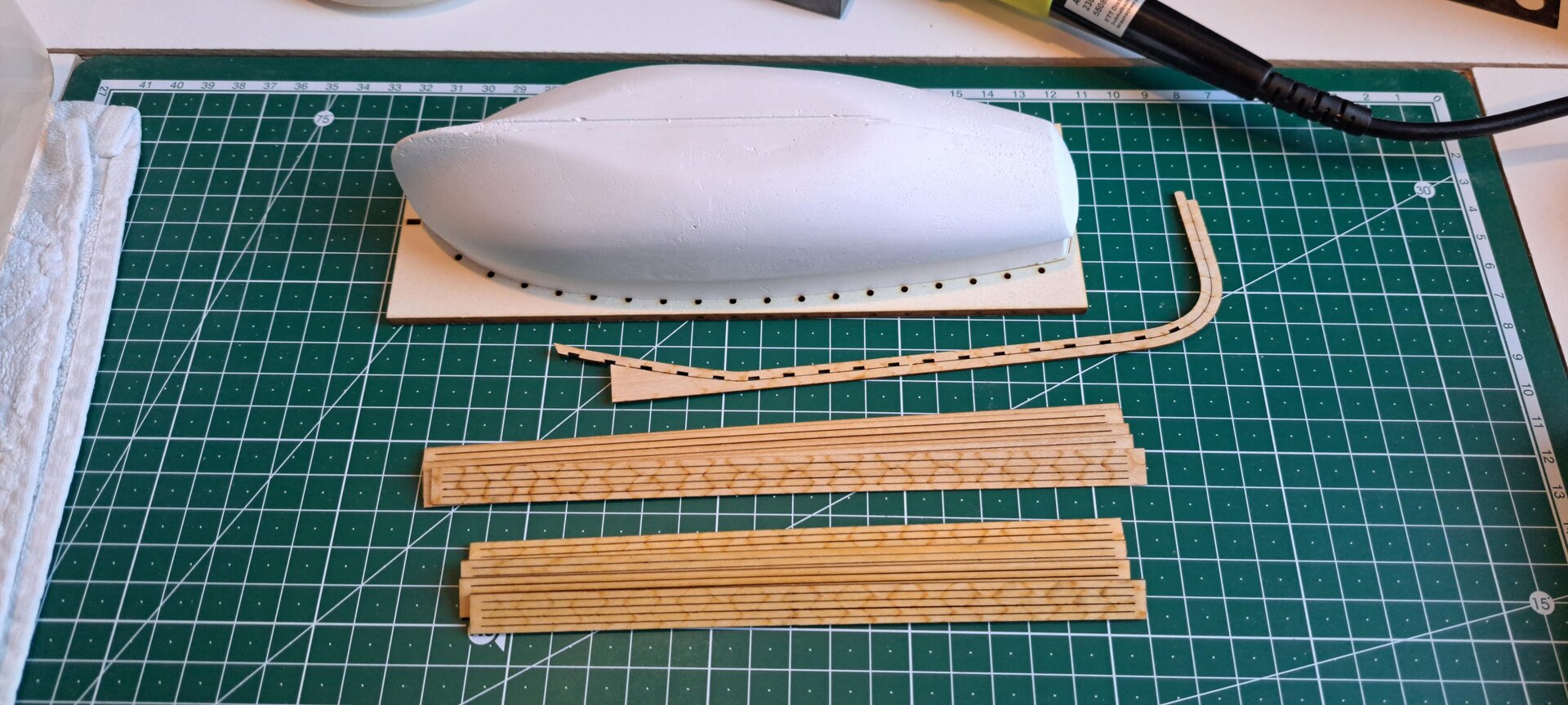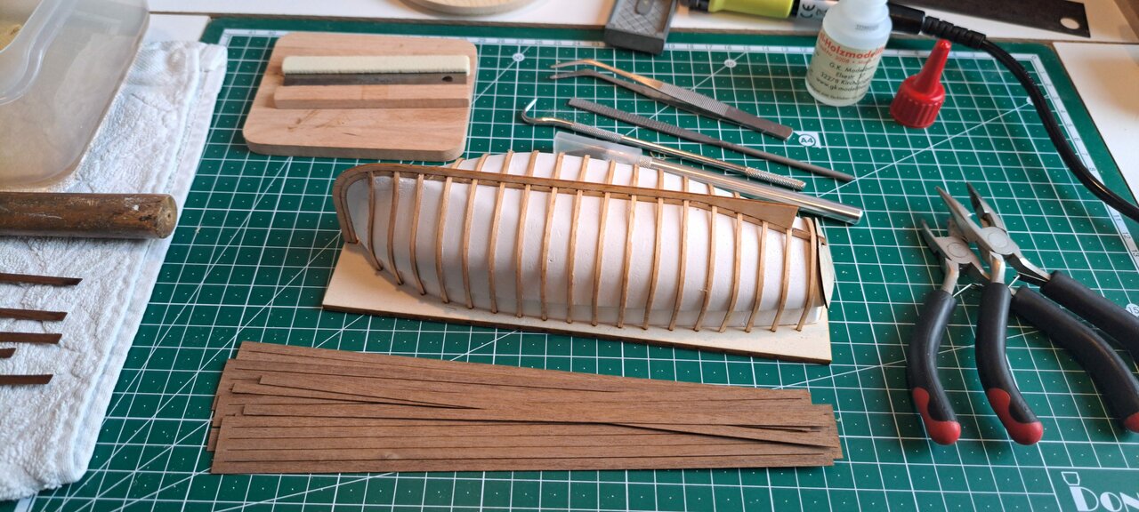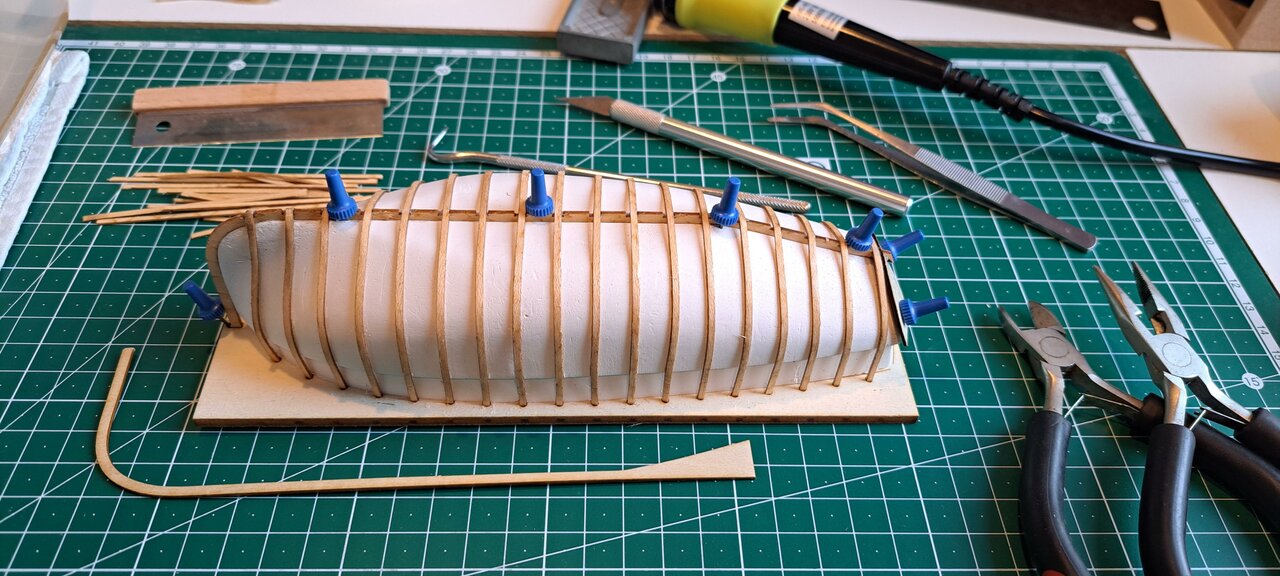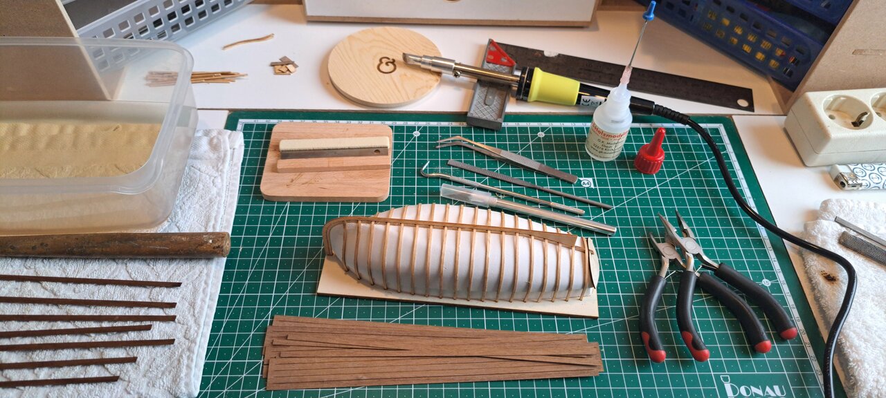 Hamburg, 29.01.2024: Zunächst erfolgt die Anfertigung des Spantengerüsts auf der dafür vorgesehenen Malle. Hierzu folge ich den vorgesehenen Bauschritten wie in der ausführlichen und detailliert bebilderten Bauanleitung von GK-Modellbau beschrieben. Neben der Malle wird der Heckspiegel, das zweiteilige Kielholz und zwei Dutzend Spanten (1x2mm) benötigt. Als hilfreiches Werkzeug haben sich ein Lötkolben mit Form- und Biegespitze, ein Mini-Seitenschneider zum Kürzen der Spanten sowie eine Mini-Spitzzange zum Straffen der Spanten herausgestellt. Stoßnadeln zum Fixieren des Kielholzes und des Heckspiegels auf der Malle sind ebenfalls sinnvoll, unentbehrlich ein Fläschen Spezial-Holzmodellbau-Schnellkleber.