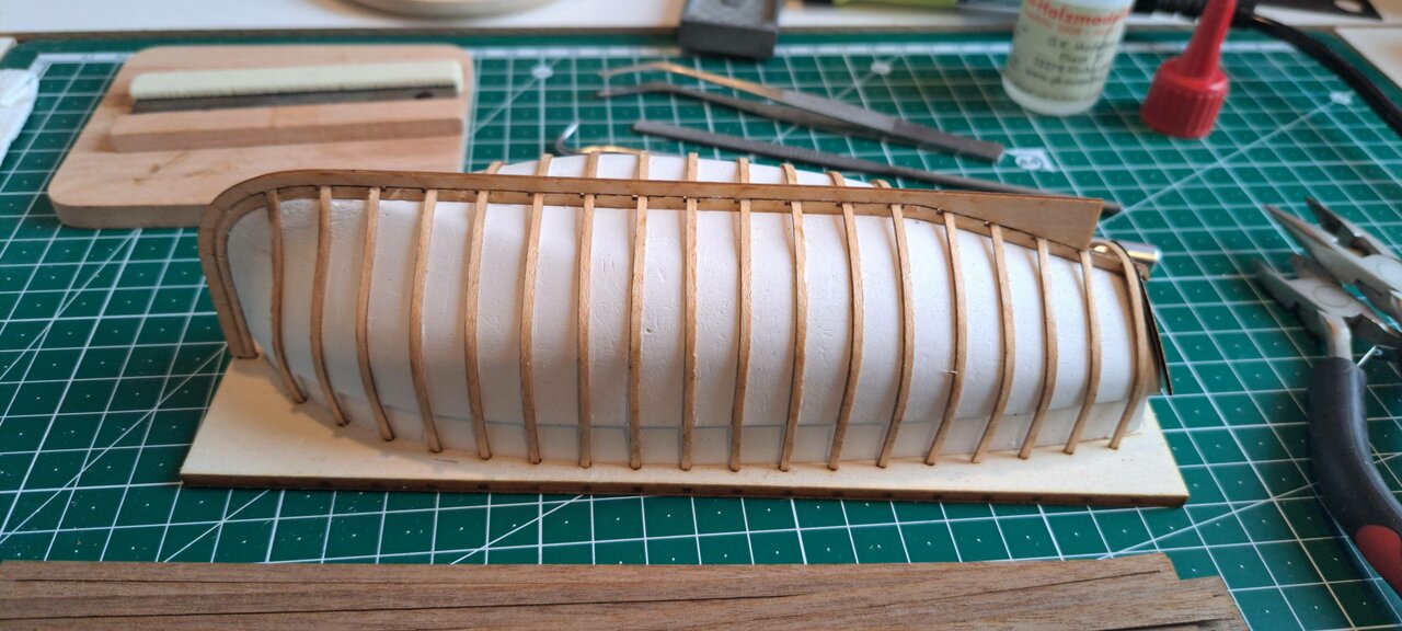 Zunächst wird der gut gewässerte Heckspiegel mit der erhitzten Formspitze des Lötkolbens auf der Malle in Form gebügelt und mit zwei Stoßnadeln fixiert. Anschließend wird das Kielholz ebenfalls mit Stoßnadeln auf der Malle fixiert und mit einem Tropfen Kleber am Heckspiegel fixiert. In der Mitte beginnend, werden die gut gewässerten Spanten jeweils auf einer Seite in die Bohrung eingesteckt und dadurch fixiert. Dann die Spanten langsam mit der Formspitze auf der Malle aufbügeln, am Kielholz mit einem Tropfen Kleber fixieren, mit dem Seitenschneider ablängen, in zweiten Bohrung fixieren und mit der Spitzzange oder Pinzette nachstraffen. Anschließend die fixierten und noch feuchten Spanten mit der Formspitze der Malle anpassen und "trockenbügeln". Sobald alle Spanten gesetzt und verklebt sind, das untere zweite Kielholz schnurgerade mittschiffs ausrichten und ebenfalls verkleben. Nach rund 2 Stunden Bauzeit ist das Spantengerüst fertiggestellt. Ein guter Zeitpunkt für eine kleine Pause!