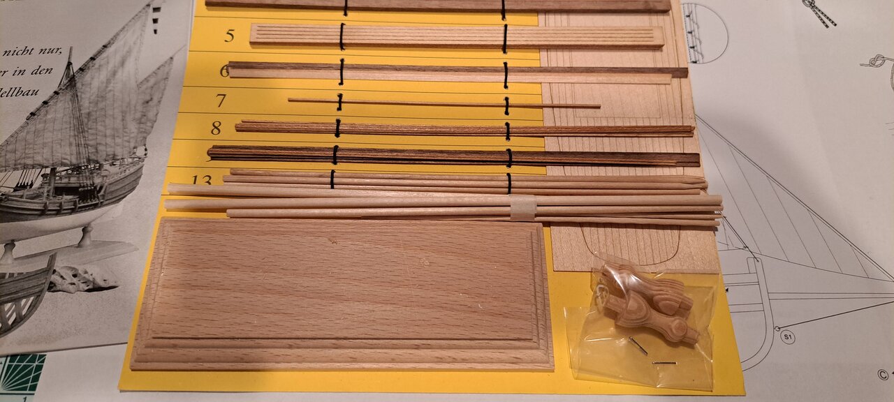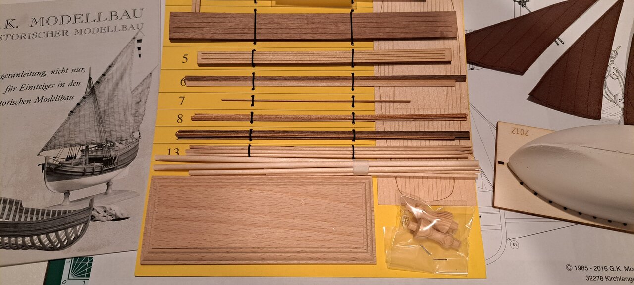 Neben den umfangreichen Plänen und Anleitungen beinhaltet der Modellbausatz von G.K.Modellbau eine aus Gips gefertigte und auf eine stabile Sperrholzbasisplatte montierte Malle, über der später das Spantengerüst gefertigt wird. Auf einem etwa DIN-A4-formatigen gelben Karton ist sämtliches Baumaterial sauber gegliedert, befestigt und durchnummeriert. Hier findet sich unter anderem das zweiteilige Kielholz und die bereits vorgeschnittene Decksbeplankung. Diverse Leisten, Planken und Kanthölzer dienen der Fertigung von Spanten, Decksbalken, Rumpf- und Decksplanken. Aus diversen Rundhölzern können Mast, Bäume, Stengen und Spieren gezogen werden. In verschiedenen, transparenten Kunststoffbeutelchen sind unter anderem die Riggbeschläge wie Ösen, Blöcke und Jungfern, und die gelaserten Kleinteile für Decksaufbauten, Oberlichter, Luken, Nagelbrett und Baumbeschläge verpackt. Drei bereits fertig vernähte und braun eingefärbte Segel, sowie dunkles und helles Takelgarn für stehendes und laufendes Gut ermöglichen das stilgerechte riggen und takeln. Abgerundet wird der Kartoninhalt durch ein sehr sauber gefrästes Ständerbrettchen aus Buche und zwei passende, ebenfalls sehr sauber gedrechselte Ständersäulchen zur späteren Befestigung des Schiffsmodells. Der Preis liegt zum Erwerbszeitpunkt (2023) bei ca. 66,- EUR und bietet nach meiner Einschätzung ein unschlagbares Preis-Leistungs-Verhältnis!